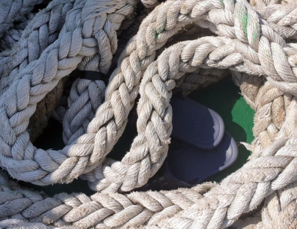→浮遊物をロープで曳いて、陸地に向けて曳航