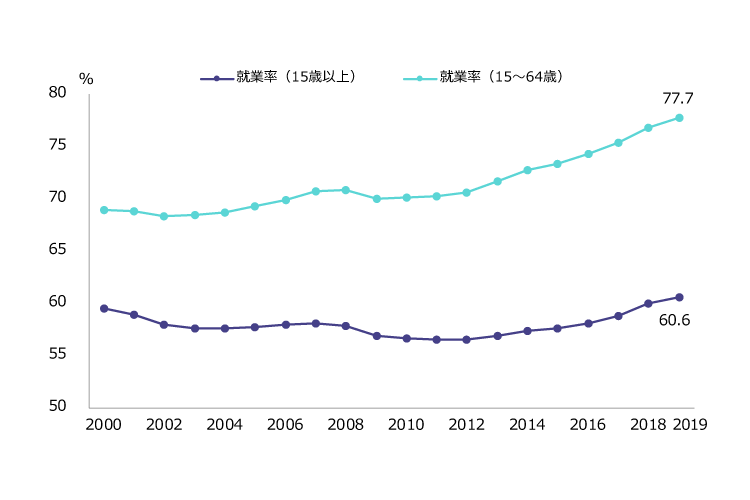 総務省「労働力調査」によると、2019年の就業率は、15歳以上で60.6%(前年比+0.6%pt)、15~64歳で77.7%(同+0.9%pt)となり、就業率は着実に上昇している(図1)。就業率に関する政府目標※はすでに達成されている。また、労働力人口は6886万人と前年から+56万人と増加(同+0.8%)、非労働力人口は4197万人と前年から-66万人と減少(同-1.5%)しており、労働参加もしっかりと進展している(図2)。
