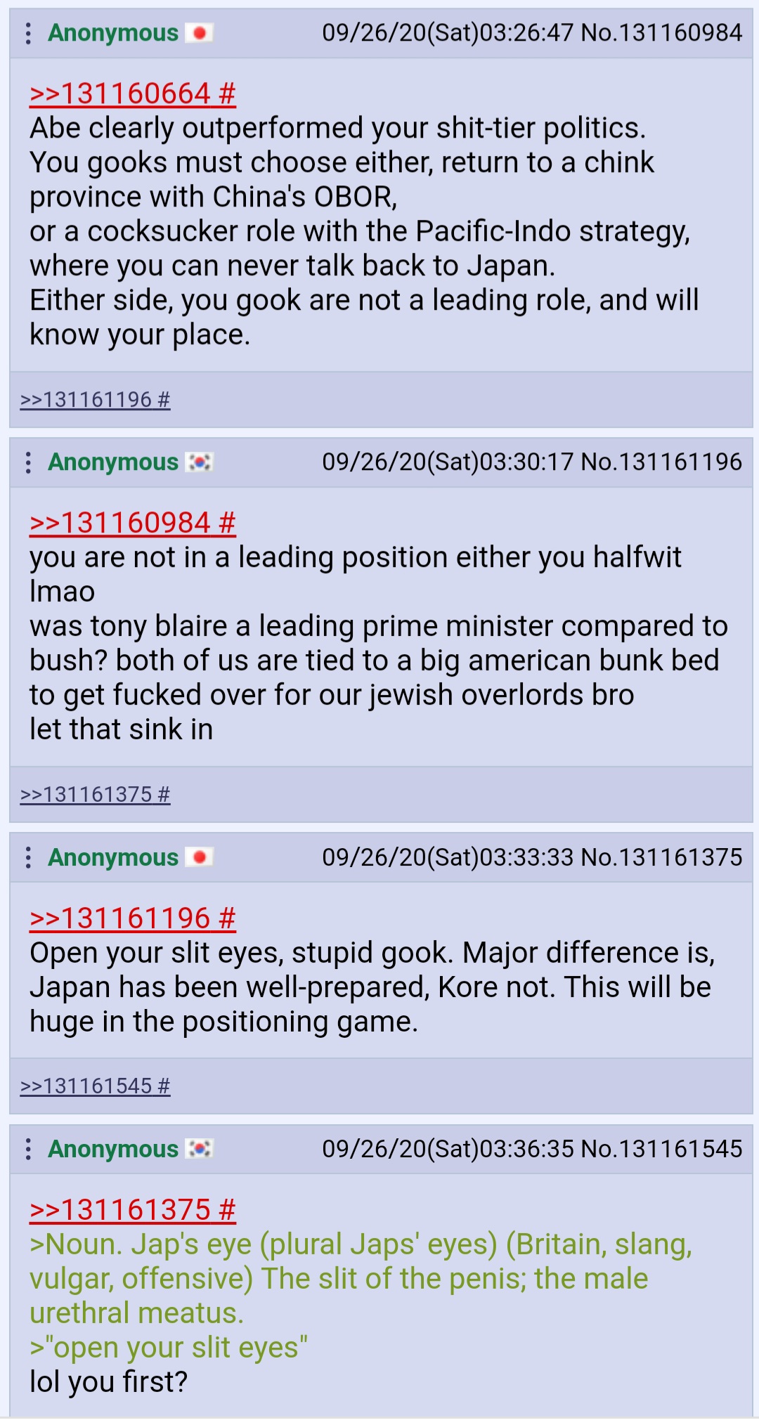 1<^오^> 티모2020/09/26(Sat) 04:32:00ID:EyNzQ0Mg=(1/2)NG報告https://boards.4channel.org/int/thread/131152516영미권 커뮤니티 사이트에서 한국과 관련된 스레드가 세워졌습니다. 주제는 아시아의 폴란드 한국.도중에 갑자기 등장한 한국인 국뽕.폴란드를 폄하하고 한국을 치켜세우며 공통점은 2차대전 당시 침략을 받은것 밖에 없다고 말합니다.결국 일본인 유저와 싸움이 일어나고 말았네요.너무 슬픕니다.>>2>>4>>7>>9>>24>>28>>31>>43>>56>>59>>68>>74>>81>>96>>115>>117>>118>>122>>124>>128>>1300