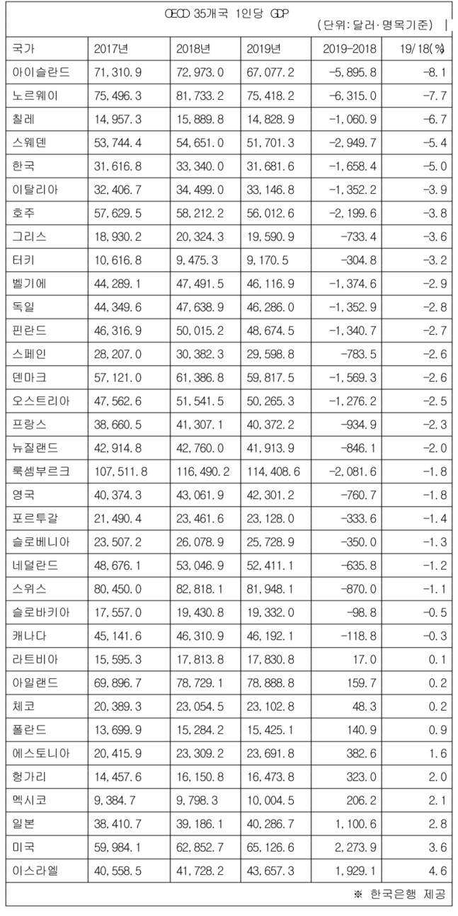 ◇韓国の2019年度一人当たり名目GDP、昨年OECD中5番目に大きく減少した。