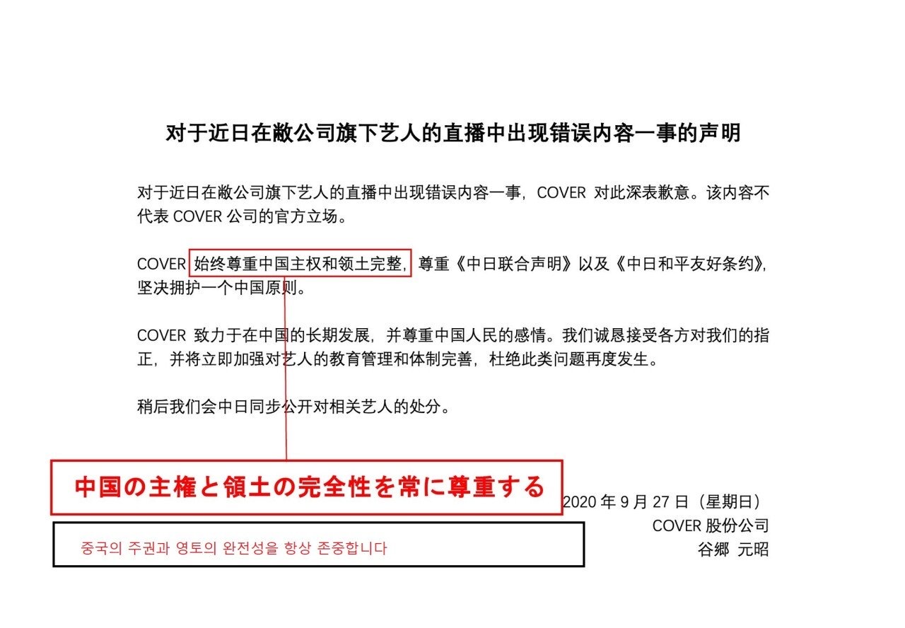 2人の所属するカバー株式会社が、謝罪文を出したが、中国語版の謝罪文において、「一つの中国」を認めるような内容であったため、日本と台湾の人が怒った模様。※日本語版には書いていない?>>1