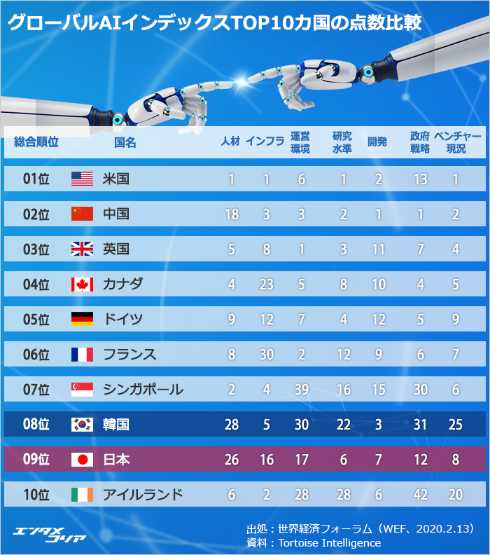 全国経済人連合会が15日発表したところによると、国家別に人工知能(AI)のレベルを比較した「グローバルAIインデックス」を分析した結果、韓国は優れた情報通信技術(ICT)インフラを誇りながらAI産業の成長が遅れていることが分かったという。