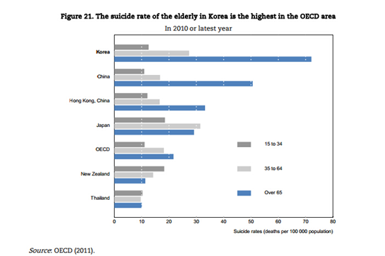 このデータは李明博が大統領在任中のものだが、65歳以上の自殺率は今や成層圏を突き抜けているに違いない。