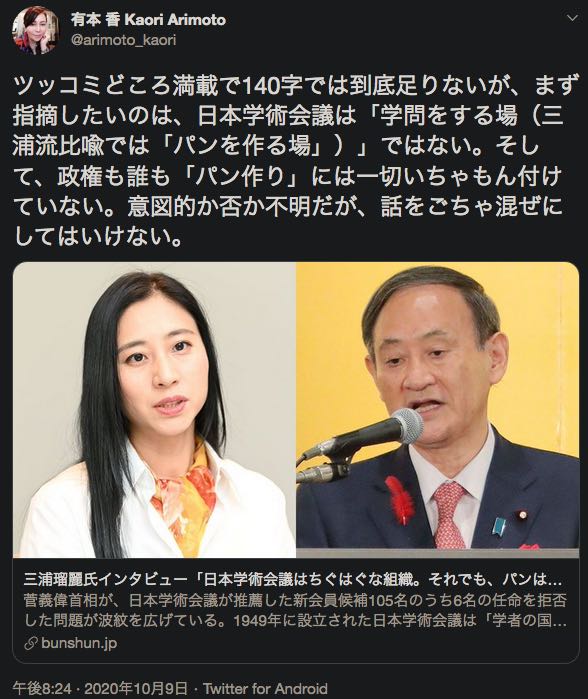 三浦瑠麗は「日本学術会議」が学問をする場だと思ってるようだ。
