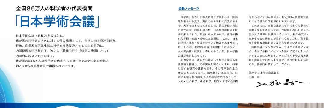 日本学術会議は、我が国の人文・社会科学、生命科学、理学・工学の全分野の約87万人の科学者を内外に代表する機関であり、210人の会員と約2000人の連携会員によって職務が担われています。