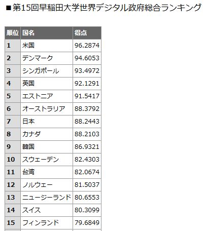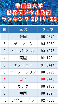 今年で15回目の「早稲田大学世界デジタル政府ランキング」の結果は、1位米国、2位デンマーク3位がシンガポールだった。日本は前回同様7位。