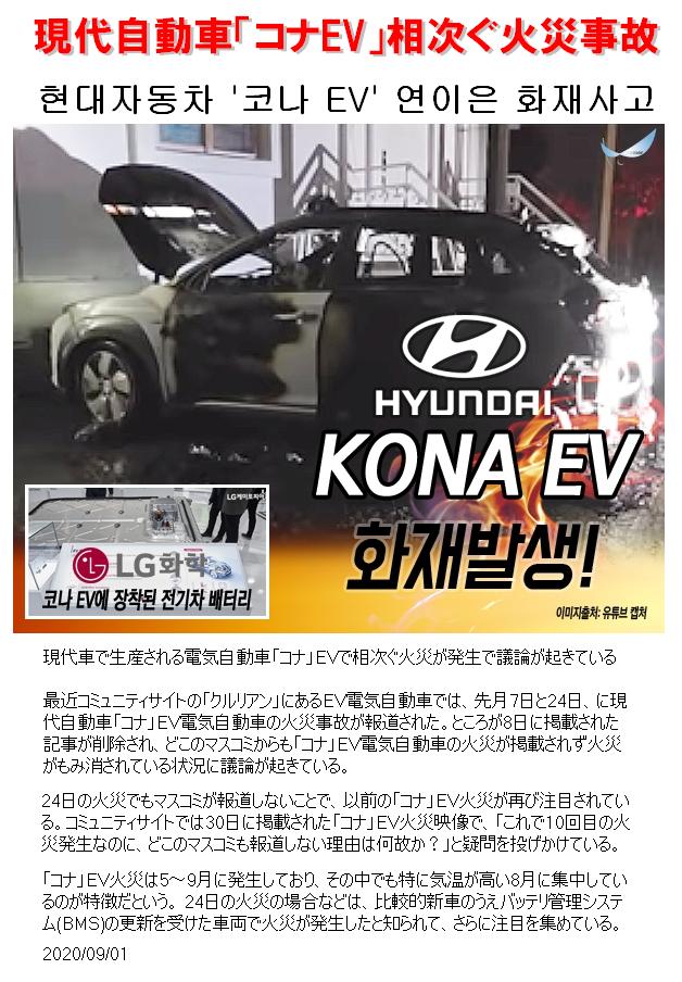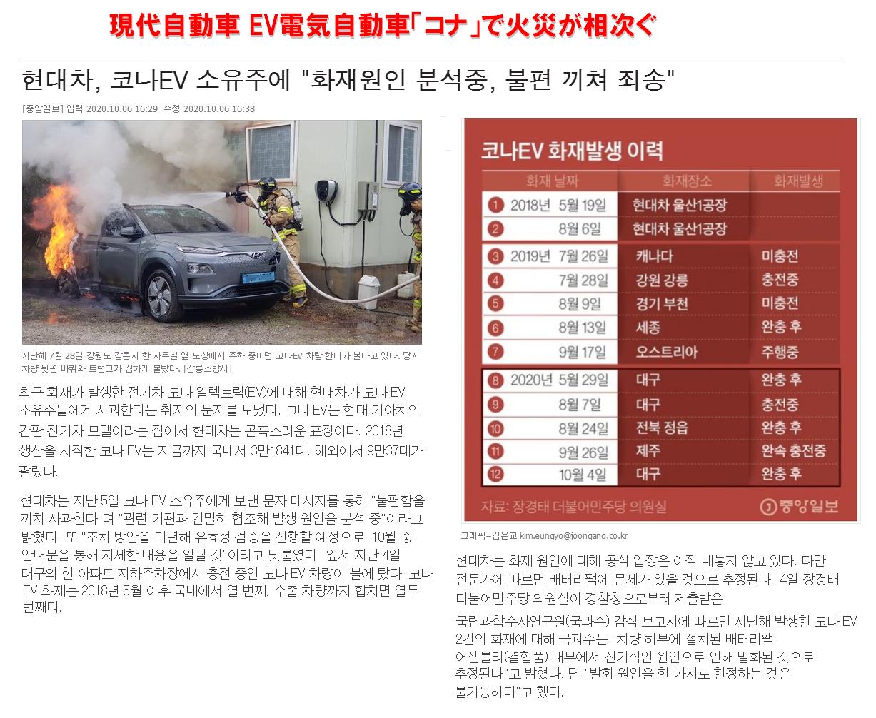 イメージリーダーでは無くて、ダメージリーダーになってるよな。現代車で生産される電気自動車「コナ」EVで相次ぐ火災が発生で議論が起きている --2020/09/01