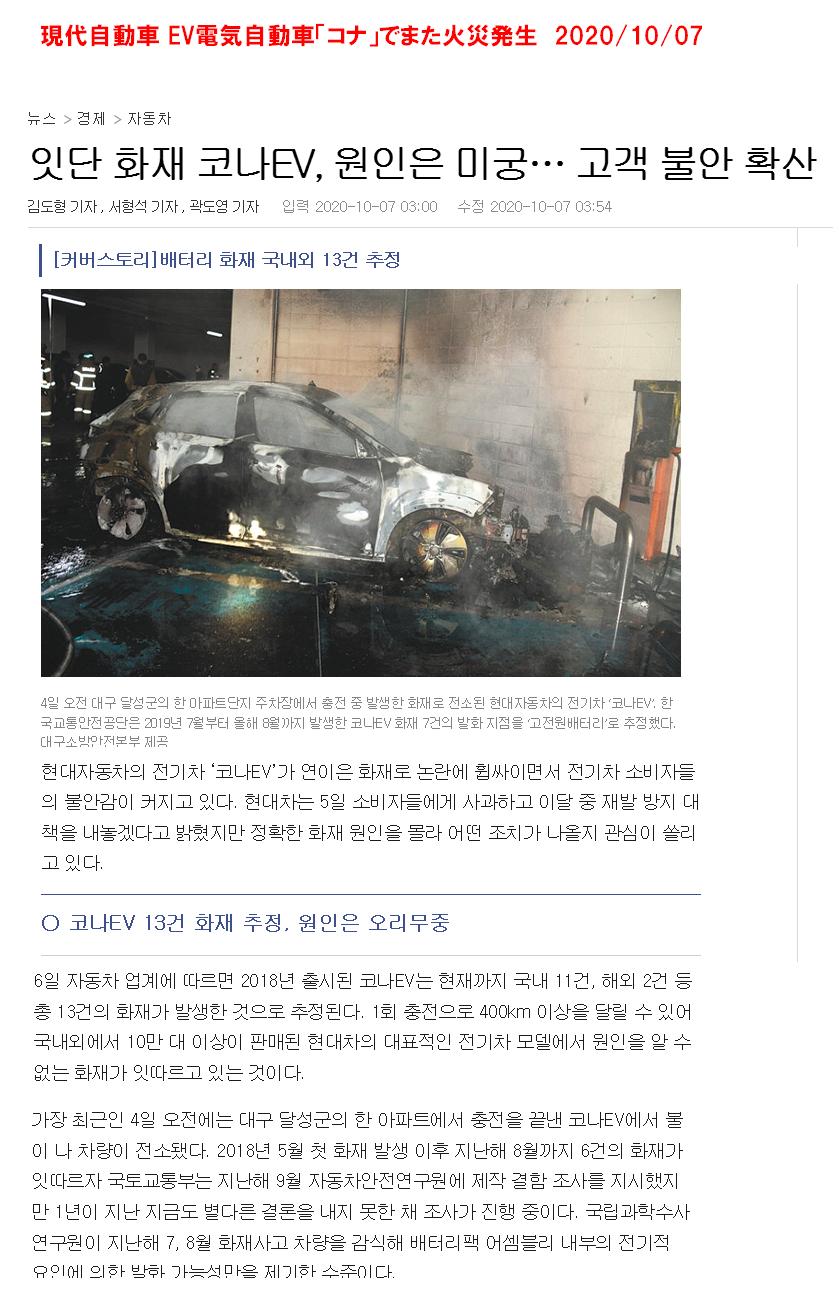 代自動車「コナ」EV電気自動車の火災事故が報道された。ところが8日に掲載された