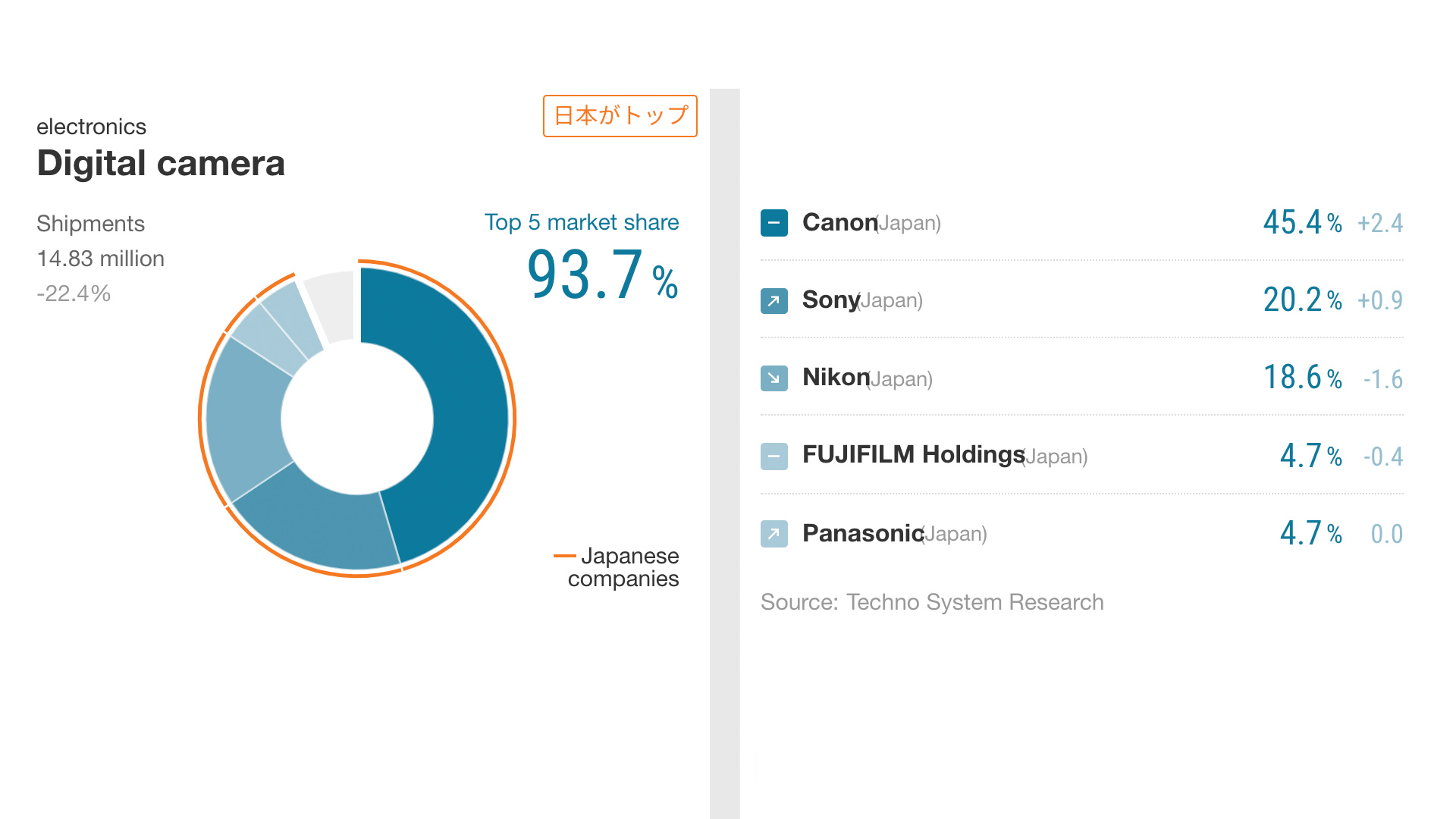 1.Canon(45.4%) 2. Sony(20.2%) 3. Nikon(18.6%) > 韓国(ランク外)