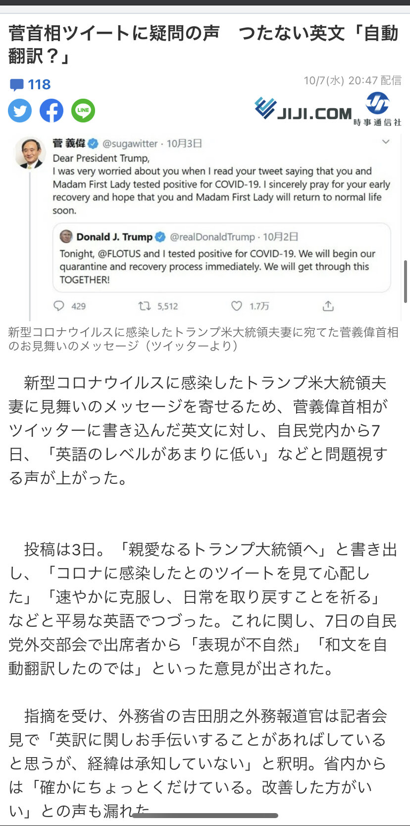 菅首相のツイート、自民から苦言 「英文のレベル低すぎる」