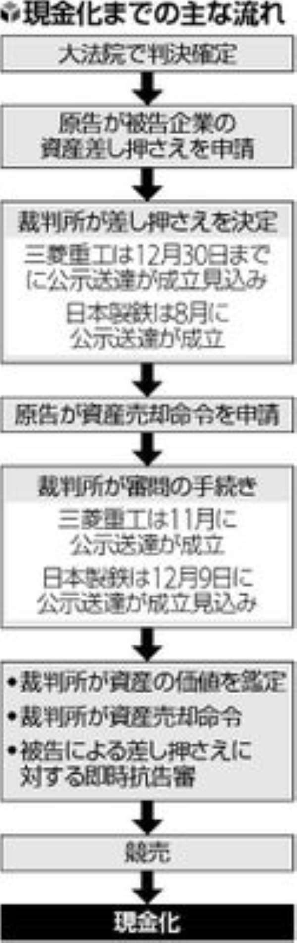 「元徴用工(旧朝鮮半島出身労働者)」訴訟問題を巡り、韓国大法院(最高裁)で三菱重工業への賠償を命じた判決が確定してから29日で2年となる。被告企業の資産を賠償に充てる「現金化」に至るまでには、手続きになお時間がかかる見通しだ。韓国政府はこの間に、賠償に応じる姿勢を見せない日本側から、何らかの譲歩を引き出したい考えだ。