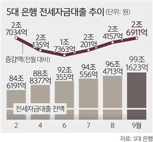 KB国民(グクミン)、新韓(シンハン)、ハナ、ウリ、NH農協銀行の5大都市銀行によると、9月末現在のチョンセ融資残高は99兆1623億ウォンで、8月末に比べ2兆6911億ウォン(2.8%)増えた。 こうした増加幅は関連集計を始めた2016年以降過去最大の今年2月(2兆7034億ウォン)とほぼ同じ水準だ。
