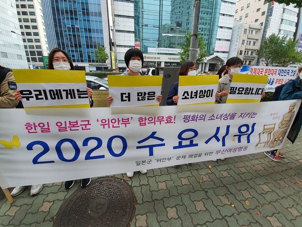 釜山女性行動は「こうした行動から分かるように、日本政府は第2次世界大戦当時の戦争犯罪を認めていない。戦争犯罪を消すために歴史不正をためらうことなく犯している。日本軍性奴隷制問題はすでに解決されたとして事実を歪曲している」と批判した。続いて「この問題は反人権的な戦争犯罪だ。加害国である日本の政府は法的賠償を行わなければならない。日本軍慰安婦の歴史を歪曲する日本政府と、それに加担する親日勢力の清算に力を合わせなければならない」と強調した。
