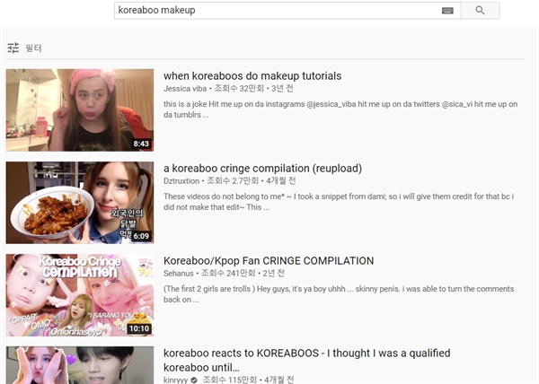 そのほかにもアイライナーで目尻を長く伸ばし、白パールアイシャドウ、道路目の下韓国「愛嬌肉」(やはり「aegyosal」と表記した)を作成した後、口紅まで韓国にグラデーションを入れてこすり出なければ、さらに韓国人に近づいた自分の姿に満足し映像が終わった(その映像は、現在では、YouTubeから姿を消した状態だ)。 「速く、非常に自然に韓国人になる」や「韓国女性のような顔の作り方」などの投稿は他にも多かった。