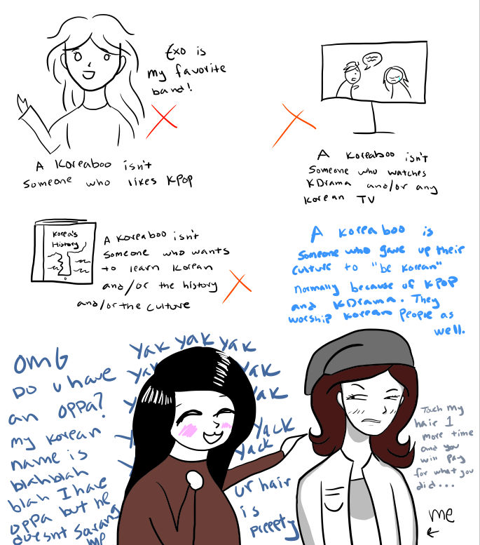 もしあなたがコリアブーだと自認しているのなら、この投稿はあなたに対して何も言っていないことを知っておいてください。しかし、私は韓国人で、韓国人として(そしてインターネットと実生活で何人かのコリアブーを経験しています)、コリアブーの行動は不快だと思います。あなたが韓国のポップカルチャーが好きなら、私は何も悪くありません。ただ、あまり極端に捉えないでください。 「極端」というのは、名前を韓国人の名前に変えたり、東アジアのステレオタイプ(かわいい、人形のような目など)を使って韓国人のように振舞ったりしないという意味です。私はそうしないことを願っています