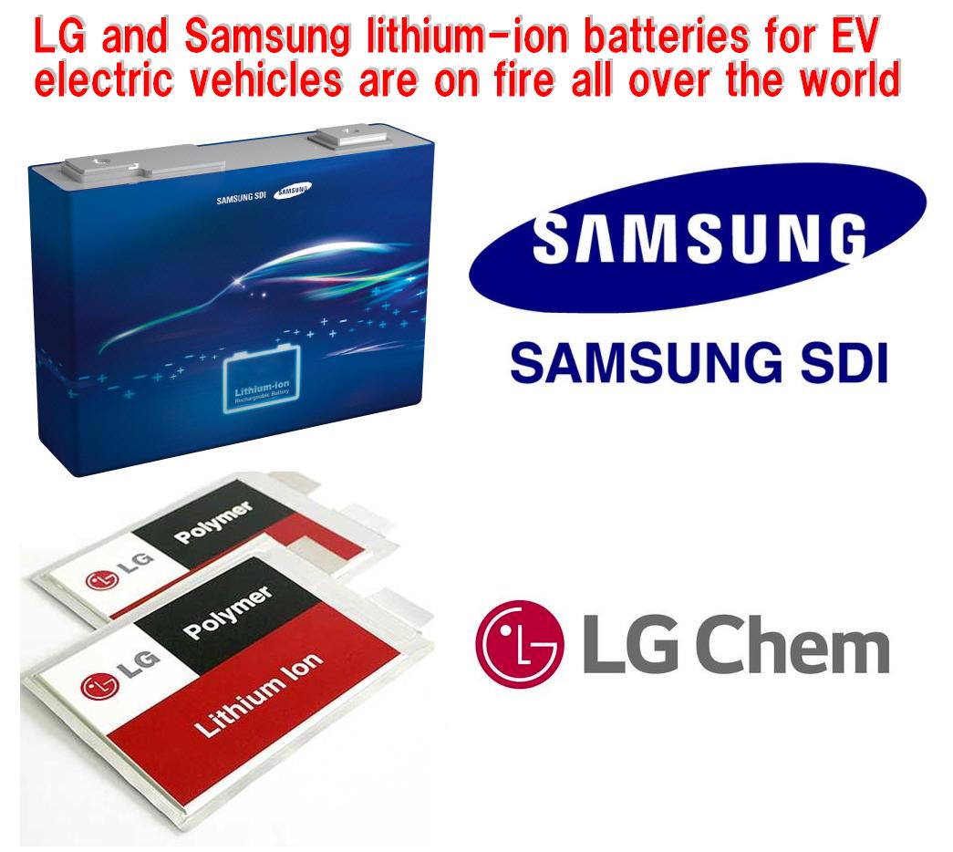 Ignition and explosions caused by LG and Samsung lithium-ion batteries installed in EV electric vehicles