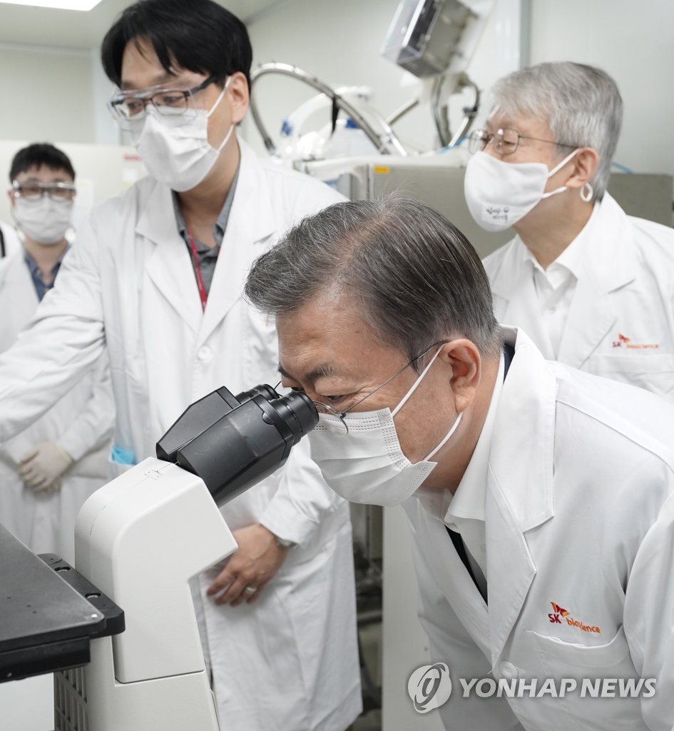 韓国の文在寅(ムン・ジェイン)大統領(手前)が新型コロナウイルスのワクチン開発に取り組むソウル近郊・城南市のバイオテクノロジー企業、SKバイオサイエンスを訪問し、研究・開発の現場を見て回った=15日、城南(聯合ニュース)