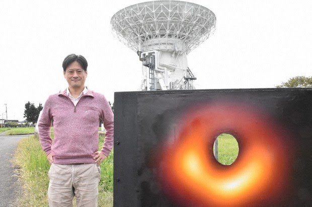 電波望遠鏡とブラックホールのパネルの前に立つ国立天文台水沢VLBI観測所の本間希樹所長=岩手県奥州市水沢星ケ丘町で>>33