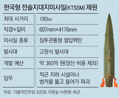 KTSSM事業は10年11月の北朝鮮による延坪島(ヨンピョンド)砲撃事件を受けて、これに対応する兵器の開発から始まった。当時の李明博(イ・ミョンバク)大統領が直接事業の着手を指示し、事業名は「稲妻事業」に決定。KTSSMは最大180キロ離れた標的を誤差範囲1、2メートル以内で打撃できるように開発された。軍によると、開発に約360億ウォン(約33億740万円)が投じられ、非武装地帯(DMZ)付近に集中的に配備された北朝鮮の長射程砲坑道陣地を突破・破壊できるとされている。