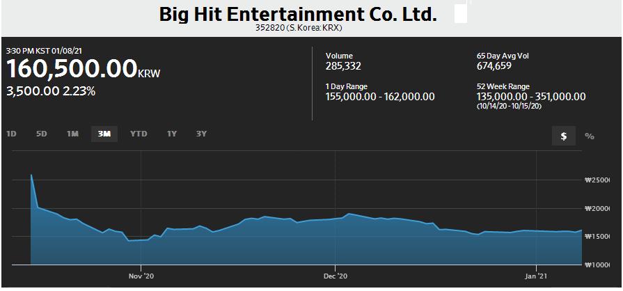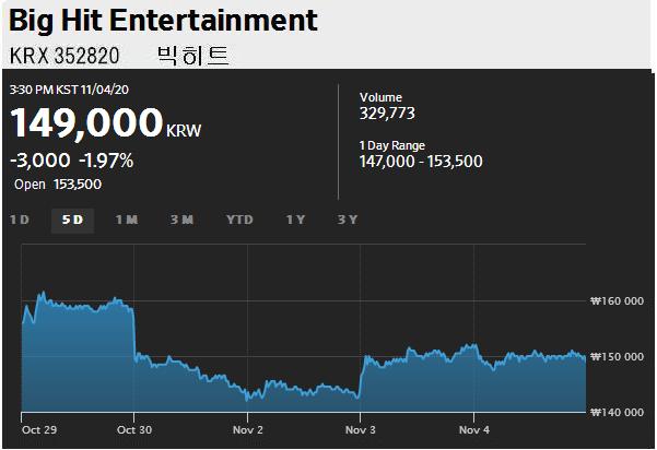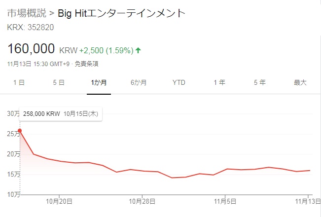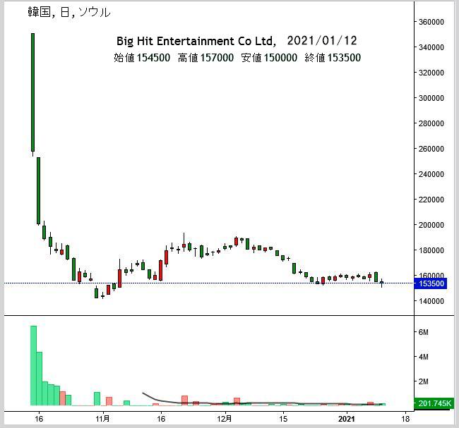 BTS事務所の株価、最高値351000ウォン(15日)から42%暴落