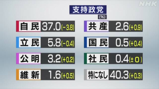 政党支持率は、自民党42%(前回47%)、立憲民主党4%(同4%)などで、無党派層は41%(同37%)となった。
