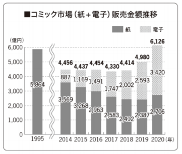 内訳は、コミックス(単行本)とコミック誌(漫画誌)を合わせた「紙のコミック市場」が前年比13.4%増の2706億円、「電子コミック市場」が同31.9%増の3420億円だった。
