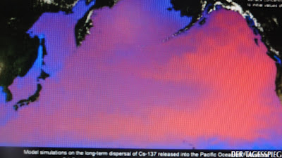 そもそも、その「放射性物質の移動経路」という図自体「グリンピース」という多くの国でテロ組織扱いされているグループが作ったとされている物の上、元になった「ヘルムホルツ海洋研究センター」のシュミレーションでは10年後でも汚染物質の主流は南北アメリカ大陸の沿岸から赤道付近の存在し、その経路も黒潮に乗って彼等の云う亜熱帯水塊形成区域「北太平洋亜熱帯モード水」の北側に沿って太平洋を東に拡がる。(但しこれは事故当時に放出された水溶性のCs137の挙動で分子として水中に存在するこれらの物質(分離可能)と今回の酸素と結合して水(T2O)となるT:トリチウム(三重水素)とではその挙動(水中での拡散大)も異なる。
