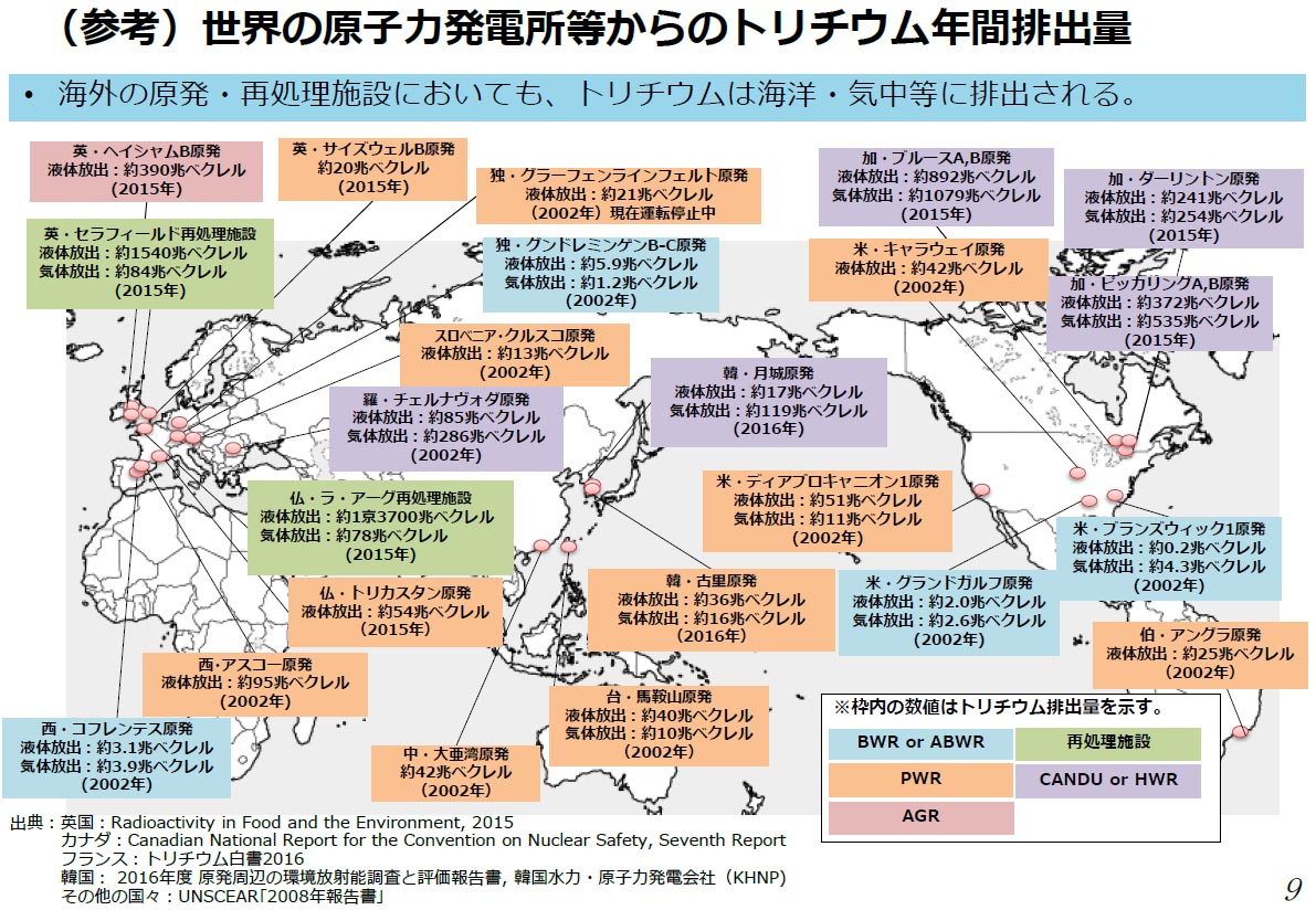 日本政府は「世界の原子力施設ではトリチウムが放出されているが、これら施設周辺でトリチウムが原因と思われる影響は見つかっていない」とし「仮にタンクの全量(福島第一原発に貯蔵されている860兆ベクレル)を一年で処分した場合でも、日本で生活する人が1年間に自然界から受ける放射線(自然放射線)の1/1000以下と、十分に小さいもの」との結論を下した。