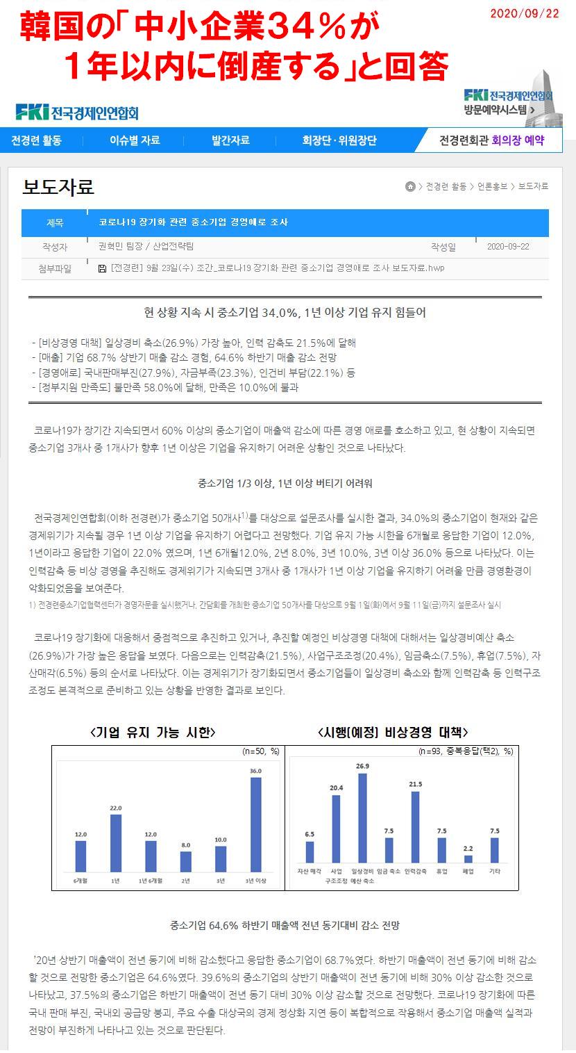民事再生:878件【韓国経済】 韓国の「中小企業34%が1年以内に倒産する」と回答 2020/09/22