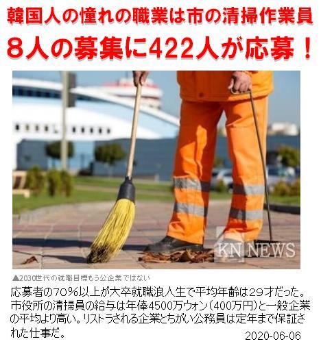 【韓国】 韓国全州市の清掃員8人の募集に大卒就職浪人生ら422人が殺到! 2020/06/06