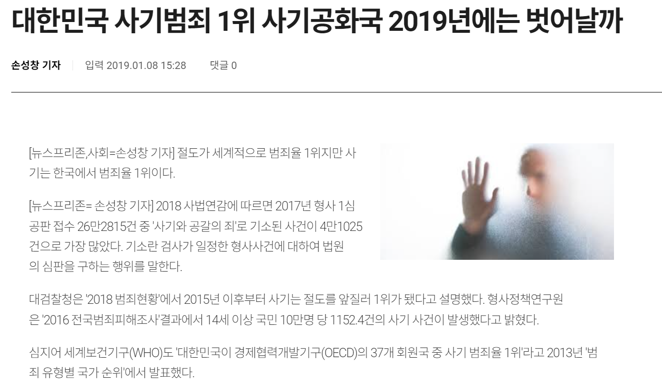 [ザ·ファクトㅣ国会=パク·スクヒョン記者]大韓民国が「詐欺犯罪」に苦しんでいる。 最近浮上した「学院街麻薬飲料」新型ボイスフィッシング詐欺、チョンセ詐欺、SG(ソシエテ·ジェネラル)証券発「株価操作」等、衝撃的な詐欺犯罪が相次いで発生し「詐欺を働くのに良い国」という話まで出てくるほどだ。 政界関係者はもちろん多数の言論、SNS(社会関係網サービス)でも関連「統計数値」を引用し、これを後押ししている。