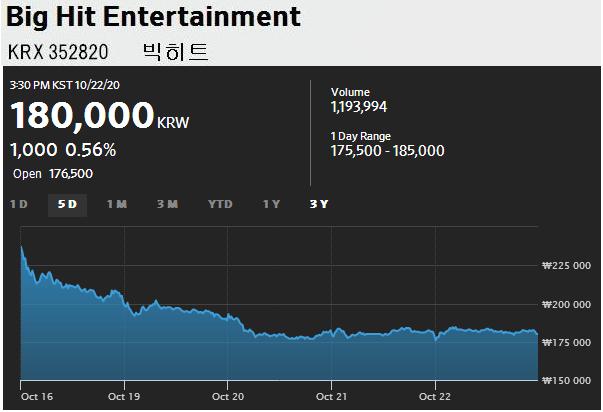 この日ビッグヒットの株価は上場後5取引日連続で下落した。19日と比較して1.92%下がった17万9000ウォンで取引を終えた。上場初日の最高値35万1000ウォンと比較すると49%の下落で、公募価格13万5000ウォンとの差まで減っている。個人投資家はこの日も4800億ウォン相当を買い越した。