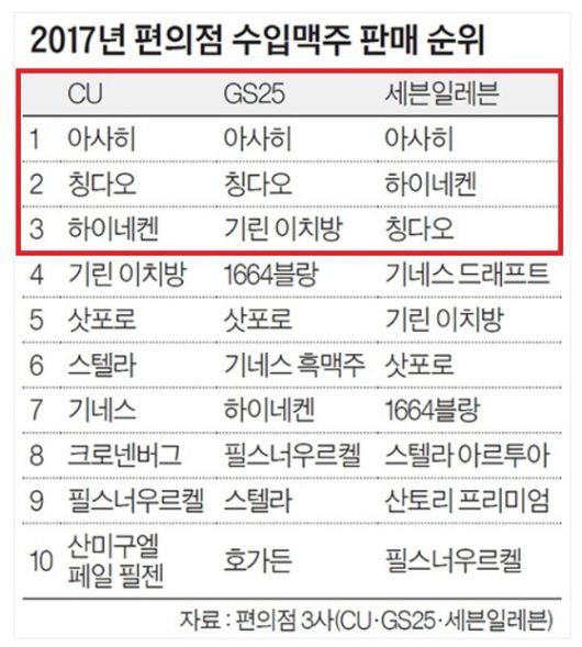 한국에서 가장 많이 팔린 것은 아사히맥주였다.>>55