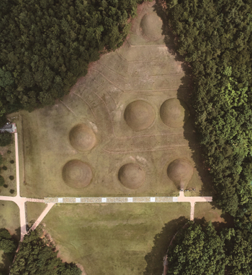 先に中長期学術調査の最初のステップとして、墓地中央部と南進入部対象に地下の物理探査を実施し、2基ずつ集まっている古墳の配置姿と封墳の規模が現在の復元整備された20m内外よりもはるかに大きく造成されたものと推定されている。