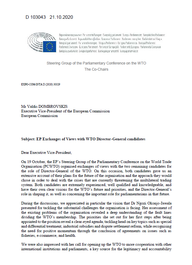 欧州議会(EP)は、世界貿易機関(WTO)事務局長候補であるナイジェリアのンゴジ・オコンジョイウェアラ氏を承認した。