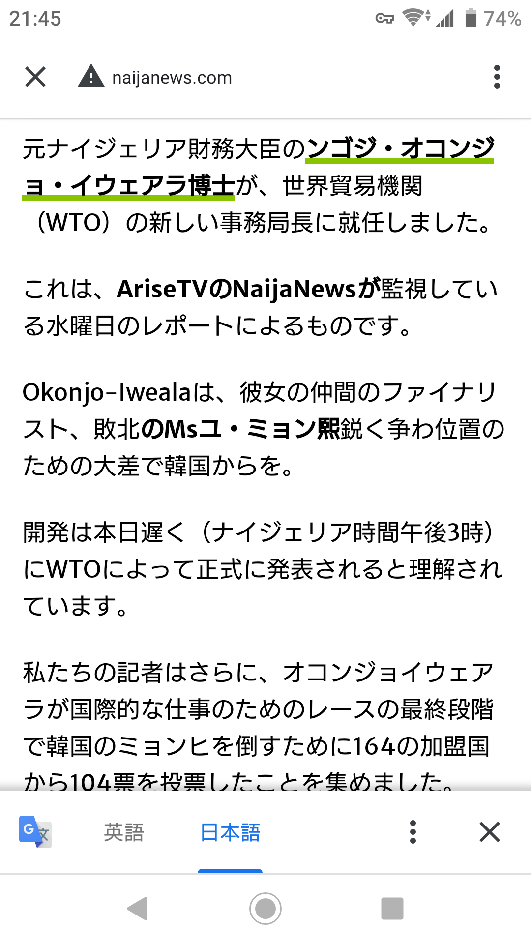 https://www.theabujatimes.com/european-parliament-backs-okonjo-iweala-wto-job-bid/WTO事務局長候補の支持調査:ンゴジ・オコンジョ・イウェアラさんが104国から支持を獲得