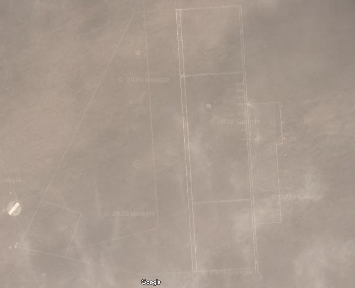 中国内陸部の衛星画像には、砂漠にナスカの地上絵のような白い線が見える。