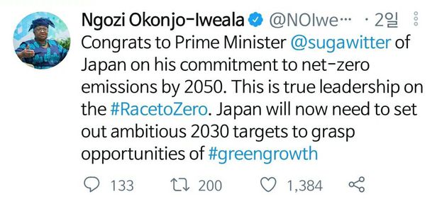 イウェアッラー候補は最近、Twitterで2050年までに「無炭素社会」に行くという菅義偉首相の計画に言及し、これを「真のリーダーシップ(true leadership)」と表現した。また「日本は今、グリーン成長のための機会を握るた」とも賞賛した。先に日本政府は、「支持する候補を言わない」としたが、日本がナイジェリアの候補を押していることを示して情況が現れたのだ。