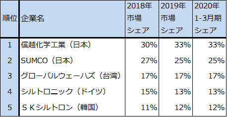 1.信越化学(33%) 2.SUMCO(25%) > 5.SK Siltron(12%) (KR)