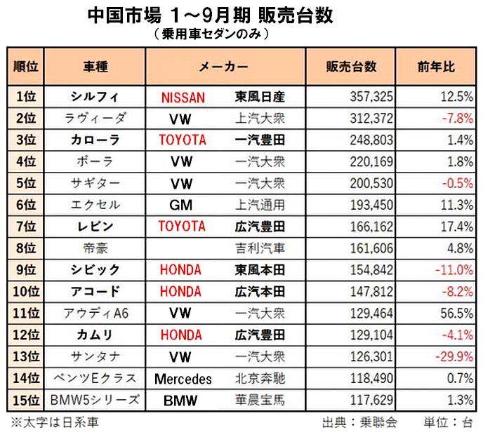 中国市場の自動車販売1~9月期 メーカー別の販売台数