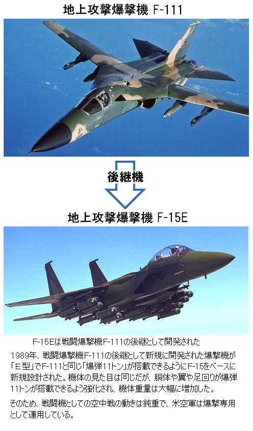 F-15Eは地上攻撃にしか使わない。空中戦をやらせると負けるから。米軍では"F-15E"はストライクイーグルと呼ばれており、ストライク(strike)とは地攻撃の意味