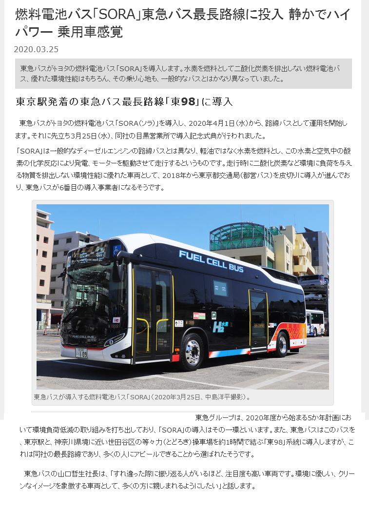 2018年からトヨタの水素燃料電池バス「SORA」の導入が都営バスで始まり、東急バスの導入