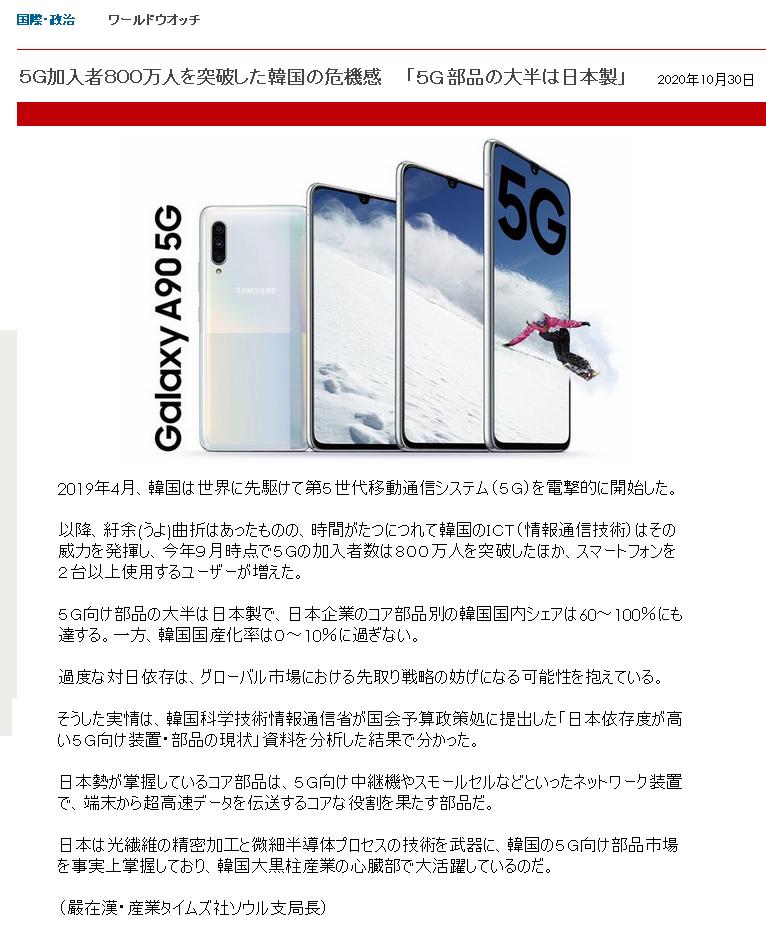 5G加入者800万人を突破した韓国の危機感・・・「5G部品の大半は日本製」 2020/11/04