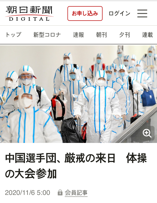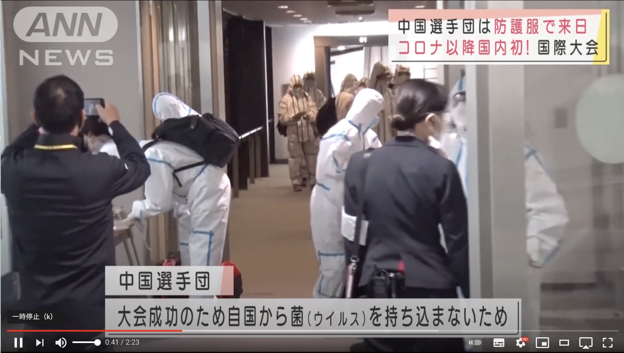 韓国は・・・www感染の酷い欧米では、自国で国際イベントを開催するにあたり、海外からの出場選手が、本国に滞在している段階から『バブル』(泡)で包むようにして、外部との接触を完全遮断し、その泡ごと自国に入国させる『バブル方式』と呼ばれる手法での出入国が主流となっています。そして、この大会も『バブル方式』を取り入れたのですよ。なので、先月、責任者が、参加国に対して、次のように要請をしています。「日本にウイルスを持ち込ませないことが最優先課題。いずれのチームも『バブル』の中で完璧に隔離された、無菌状態のイメージで参加するように」と。中国チームは、その、主催者側の要請を忠実に順守しただけですよ。だから、防護服も、なんか『泡』っぽいでしょ?(笑)。という冗談は、さておき、これは、外交的なナニか?がありそうですね。招待国は米露中の3ヶ国なのですが、米露2ヶ国の選手団は、チャーター機や、専用機での入国なのですが、中国の選手団だけ、民間機での入国なのですよ。日本政府が、入国措置の特例を容認するにあたり、ナニか〝嫌がらせ〟をして、中国の選手団だけ、民間機になったんじゃないですかね?。それに対する〝あてつけ〟みたいなモンじゃないですかね?。