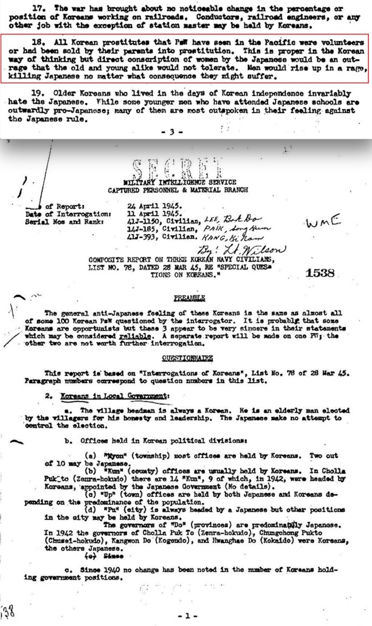 上の画像は、1945年連合国軍事情報局で、日帝民間人軍属として活動をしていた朝鮮人捕虜3人を尋問した記録。