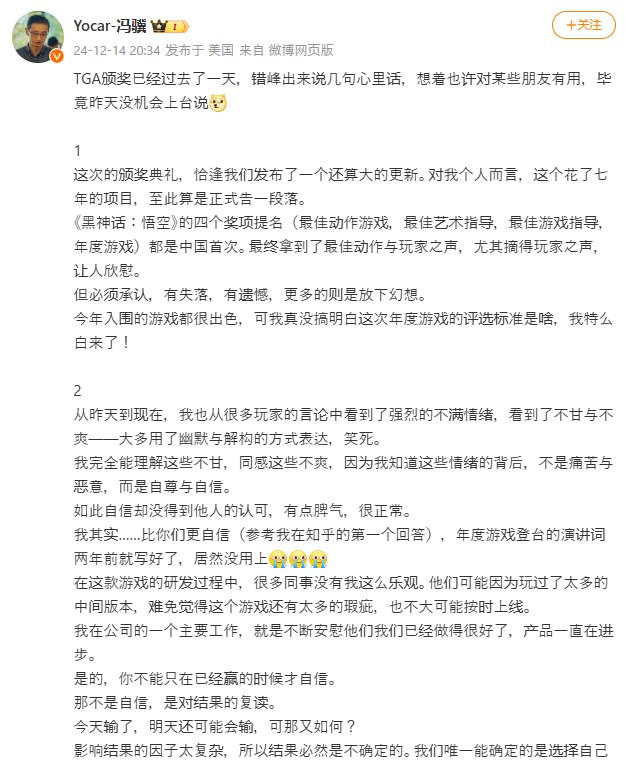 そしてTGA 2024において『黒神話:悟空』は、Best Action Game・Players’ Voiceの2部門を受賞。一方でGOTYについては本作は受賞を逃し、Team ASOBIによる『アストロボット』が栄冠を手にした。この結果を受けて、Game ScienceのCEO兼本作のディレクターを務めるFeng Ji氏が、中国のSNSであるWeiboにて声明を投じ無念を伝えている。