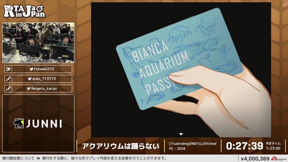 「RTA in Japan Winter 2024」にて12月28日、『アクアリウムは踊らない』のRTAがおこなわれた。「[TrueEnding(END1)],Glitched」というレギュレーションのもと、RTAプレイヤーで同作RTAのワールドレコードを保持するえふしょー氏がプレイ。SNSでは本RTAが“公開デバッグ作業”であると話題になっている。