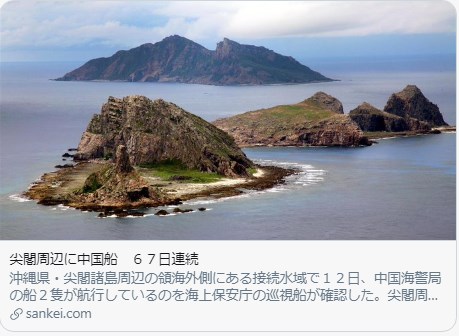 どーでもいいけどさ「尖閣周辺に中国船 67日連続」 産経新聞