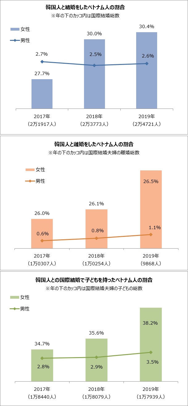韓国統計庁の発表によると2019年、妻か夫が外国人もしくは帰化者である国際結婚夫婦のうち妻の国籍ではベトナムが最多となった。