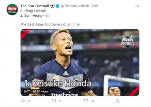 英ザ・サンは12日、公式SNSで歴代アジア選手で最高選手の順位を発表した。ザ・サンの発表によると、オールタイムナンバーワンのアジア人選手は本田圭佑だった。そして2位がソン・フンミンだった。